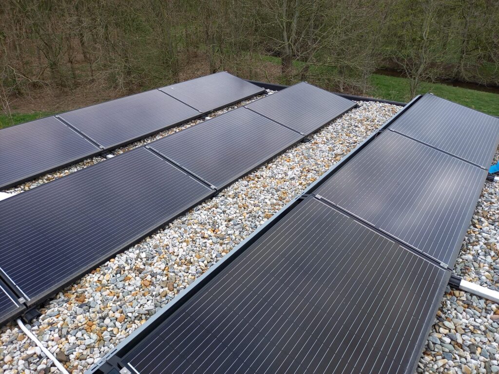 Dak met zonnepanelen en grind